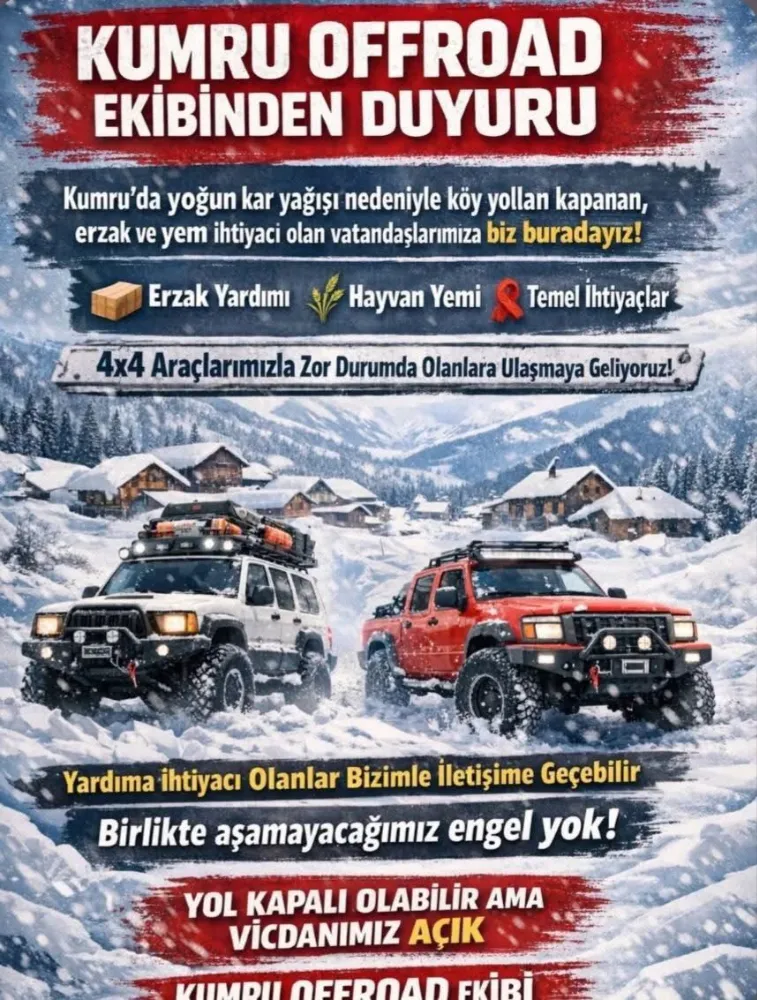 Kar nedeniyle kapanan köy yollarında mahsur kalan, erzak ve yem ihtiyacı olan, acil durum ihtiyacı olan vatandaşlara seslenen Kumru Offraod Kulübü Başkanı Ahmet Bellici, 4×4 araçlarla vatandaşların yanında olduklarını belirterek, "Yıl kapalı olabilir ama vicdanımız açık, ihtiyacı olanlar 05437433552 numaralı telefondan bizlere ulaşabilirler" dedi.