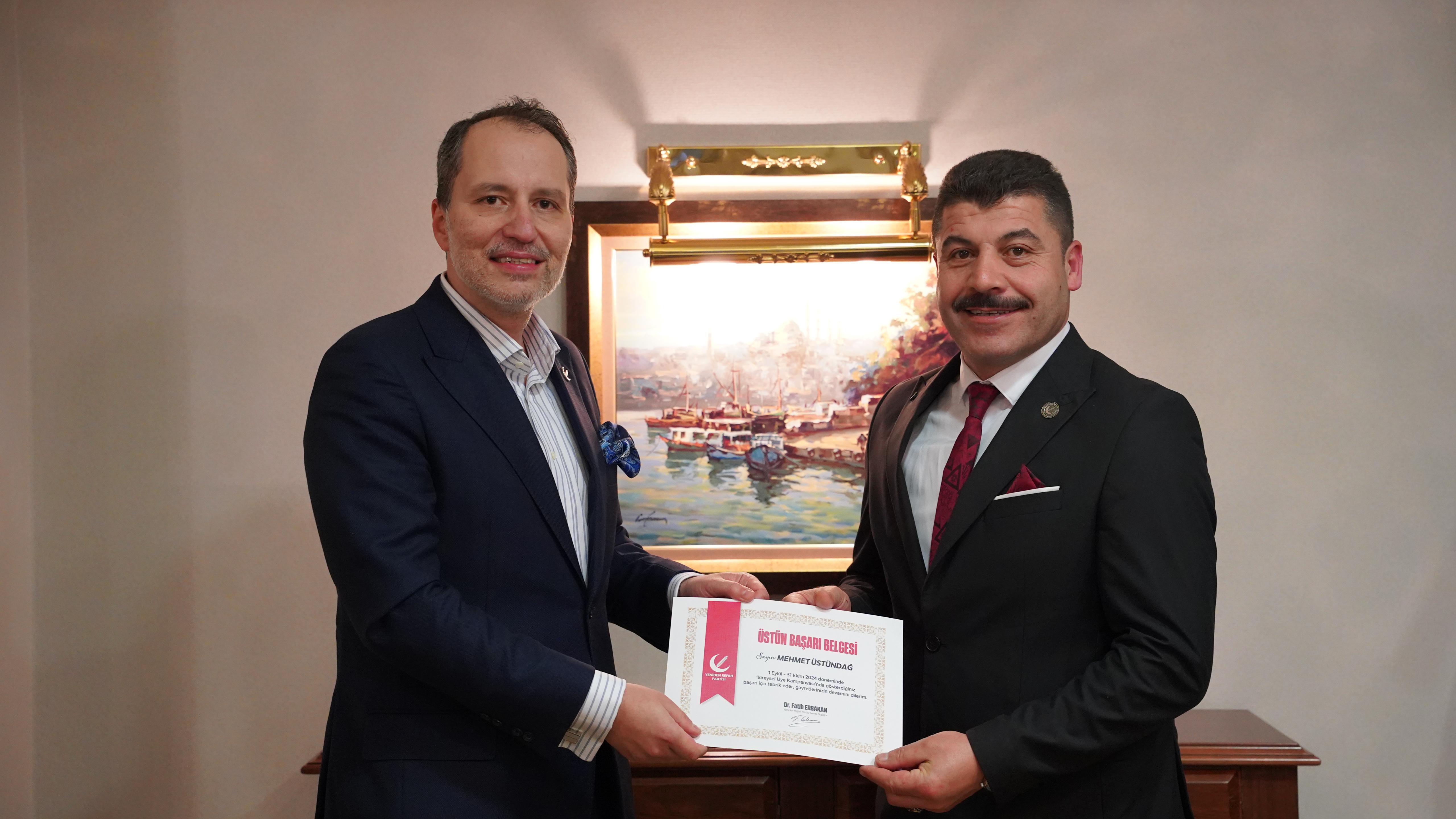 Eylül ve Ekim aylarında bireysel üye yapma kampanyasında başarı elde eden Yeniden Refah Partisi Ünye İlçe Başkanı Mehmet Üstündağ başarı Belgesini Genel Başkanın elinden aldı.