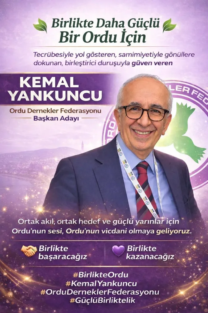 İstanbul iş dünyasının başarılı isimlerinden olan Ünyeli İş İnsanı Kemal Yankuncu, yeni dönemde Ordu Dernekler Federasyonu başkanlığına adaylığını açıkladı. Yazılı bir açıklama yapan İş İnsanı Kemal Yankuncu, "Yıllardır Yönetim Kurulu Üyesi, Başkan Yardımcısı ve son olarak Genel Başkan Vekili olarak görev yapmaktan onur ve gurur duyduğum; Ordumuzun sivil toplum alanındaki en büyük gücü, en köklü ve en kapsayıcı üst çatı kuruluşu olan Ordu Dernekler Federasyonu’nun, bu ay gerçekleştirilecek 9. Olağan Kongresi’nde Başkan Adayı olduğumu, büyük bir sorumluluk bilinciyle kamuoyumuza ve tüm Ordulu hemşerilerimize saygıyla duyuruyorum" ifadelerini kullandı.
